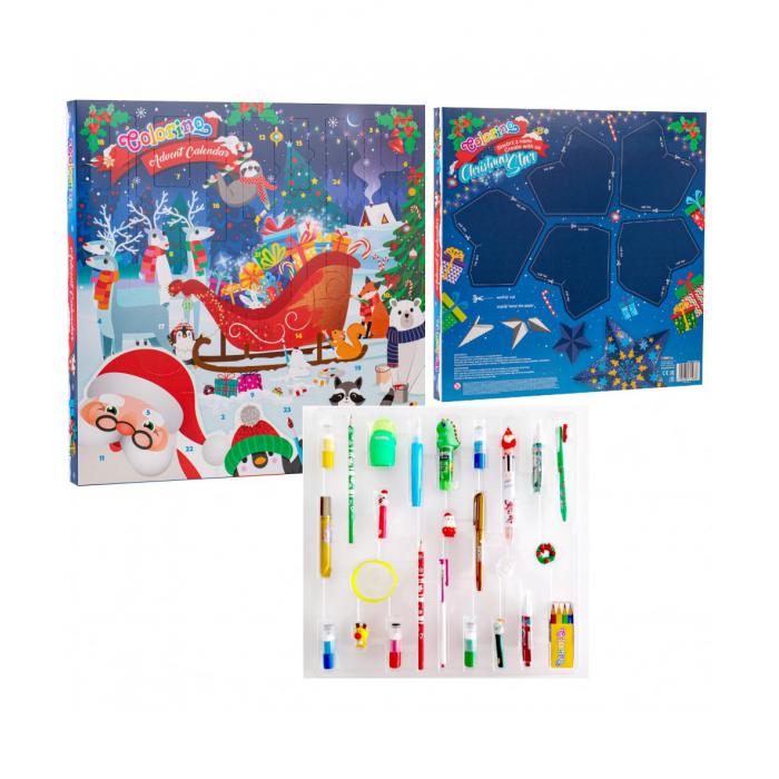 Kalendář obsahuje: silikonový náramek, tužky obyčejné, propisku se zvířátkem, gumovací propisku, lepidlo tuhe, lepidlo glitrové, mazací pryž, násadku na tužku, propisku 6-ti barevnou, zvýrazňovače, fixy a mini pastelky.