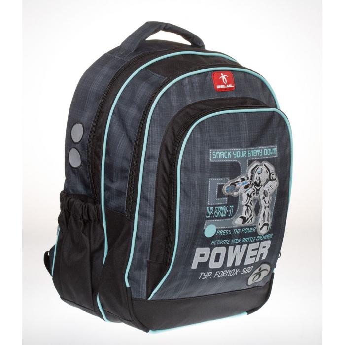 Lehký školní batoh (700g) Power s mnoha funkčními prvky. Vyroben z vysoce kvalitního a nepromokavého materiálu. Ergonomicky tvarovaná polstrovaná záda a ramenní popruhy. Polstrovaná rukojeť. Reflexní prvky.