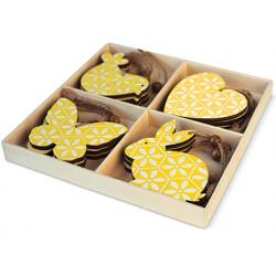 Sada závěsné dekorace ze dřeva v žlutém provedení.