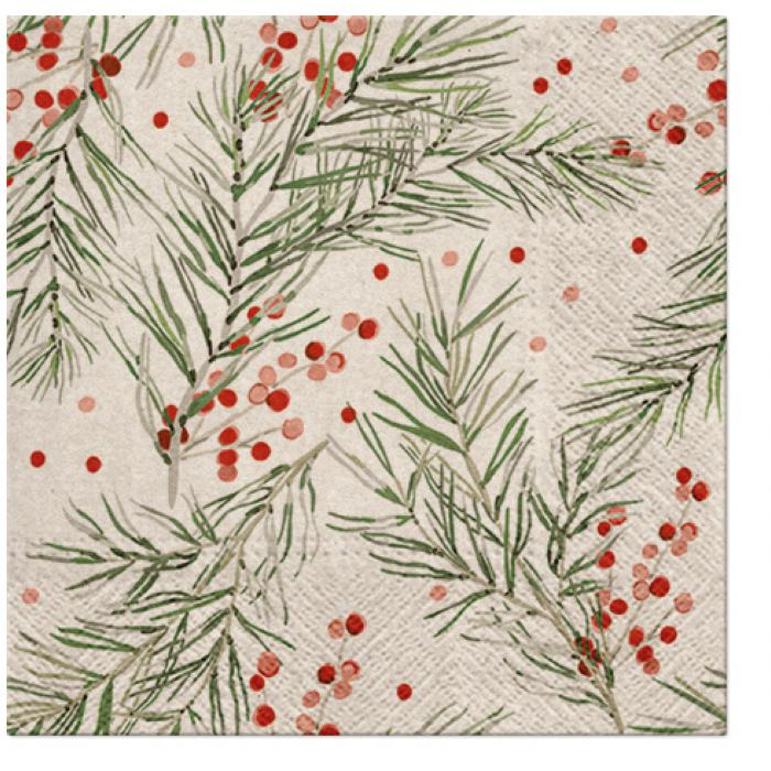 Eko vánoční ubrousek Springs Holly kat.č:SDLE 020400EAN:0Skladem:ANOmin.odběr:1 bal po 20 ksVelikost:Lunch Výrobce:Paw Papírové 100% recyklovatelné ubrousky We Care - Springs Holly.Balení obsahuje 20 třívrstvých ubrousků velikosti lunch (33x33cm).