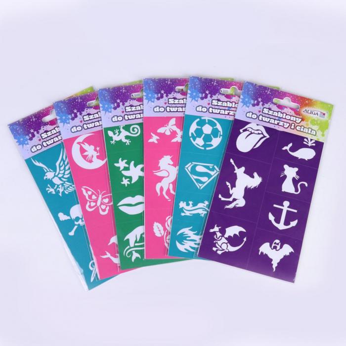 Šablony k obličejovým barvám - mix kat.č:FAS-2021EAN:5902150652021Skladem:ANOmin.odběr:1 ksVelikost:1 arch Výrobce:Aliga Šablny a obličej a kůži.Vhodný doplňek k obličejovým barvám.Mix několika motivů.