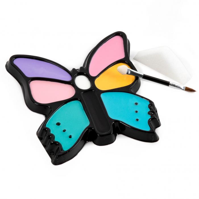 Barvy na obličej Kidea - Motýl kat.č:5901130091997EAN:0Skladem:ANOmin.odběr:1 balVelikost:8 barev Výrobce:Derform Sada barev na obličej s doplňky. Barvy jsou bezpečné, dermatologicky testované.