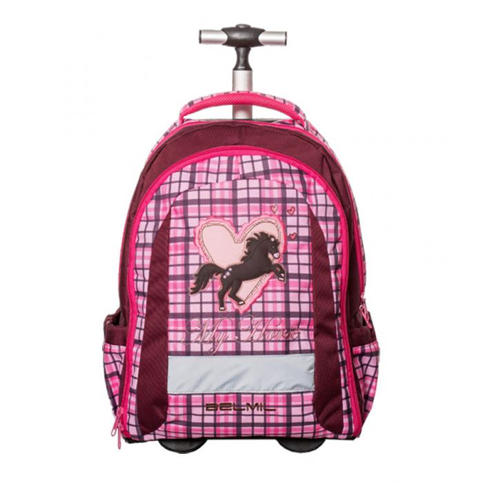 Školní batoh s kolečky (1900g) My Pretty Horse s mnoha funkčními prvky. Teleskopická rukojeť. Vyroben z vysoce kvalitního, pevného a nepromokavého materiálu. Zesílená konstrukce. Polstrované ramenní popruhy. Polstrovaná rukojeť. Reflexní prvky.