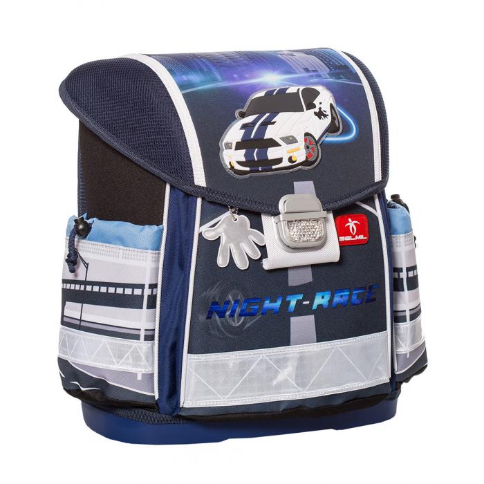Lehký školní batoh (1000g) Night Race s mnoha funkčními prvky. Vyroben z vysoce kvalitního, pevného a nepromokavého materiálu. Zesílená konstrukce a pevné dno pro lepší stabilitu. Ergonomicky tvarovaná polstrovaná záda a ramenní popruhy. Gumová rukojeť, poutko pro zavěšení. Spolehlivý a snadno použitelný kovový zámek. Reflexní prvky na všech stranách pro větší bezpečnost a viditelnost.