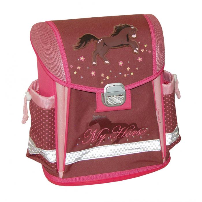 Lehký školní batoh (1000g) My horse s mnoha funkčními prvky. Vyroben z vysoce kvalitního, pevného a nepromokavého materiálu. Zesílená konstrukce a pevné dno pro lepší stabilitu. Ergonomicky tvarovaná polstrovaná záda a ramenní popruhy. Gumová rukojeť, poutko pro zavěšení. Spolehlivý a snadno použitelný kovový zámek. Reflexní prvky na všech stranách pro větší bezpečnost a viditelnost.