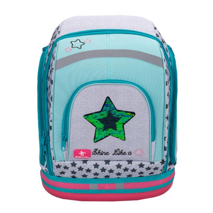 Lehký školní batoh (1100g) Shine like star s mnoha funkčními prvky. Vyroben z vysoce kvalitního, pevného a nepromokavého materiálu. Zesílená konstrukce a pevné dno pro lepší stabilitu. Ergonomicky tvarovaná polstrovaná záda a ramenní popruhy. Gumová rukojeť, poutko pro zavěšení.Reflexní prvky. Možnost připevnik ke stojánku s kolečky.