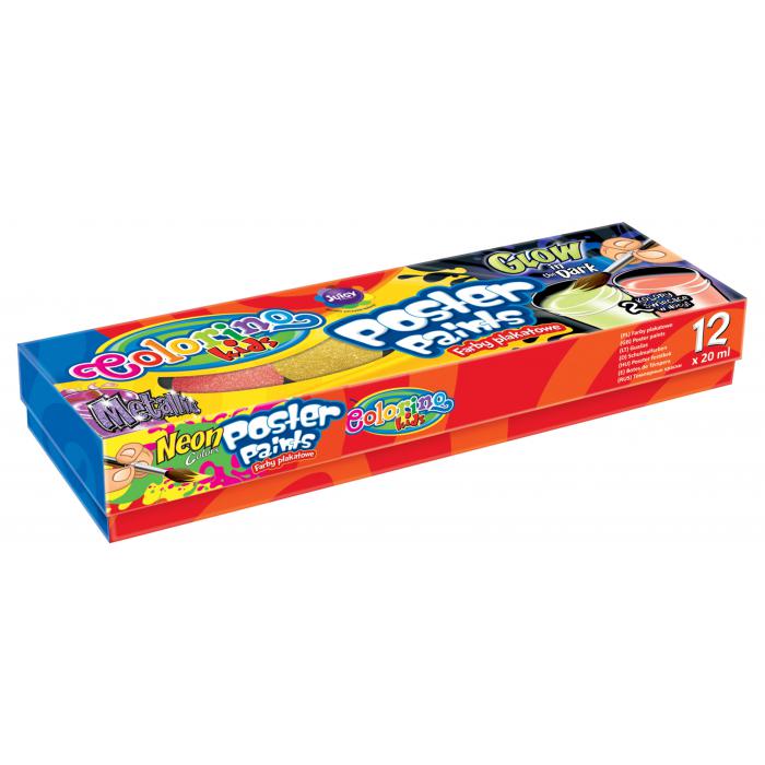 Sada temperových barev v kelímku 12 x 20ml. Sada obsahuje mix barev v několika provedeních. Svítící ve tmě, metalické, neonové.