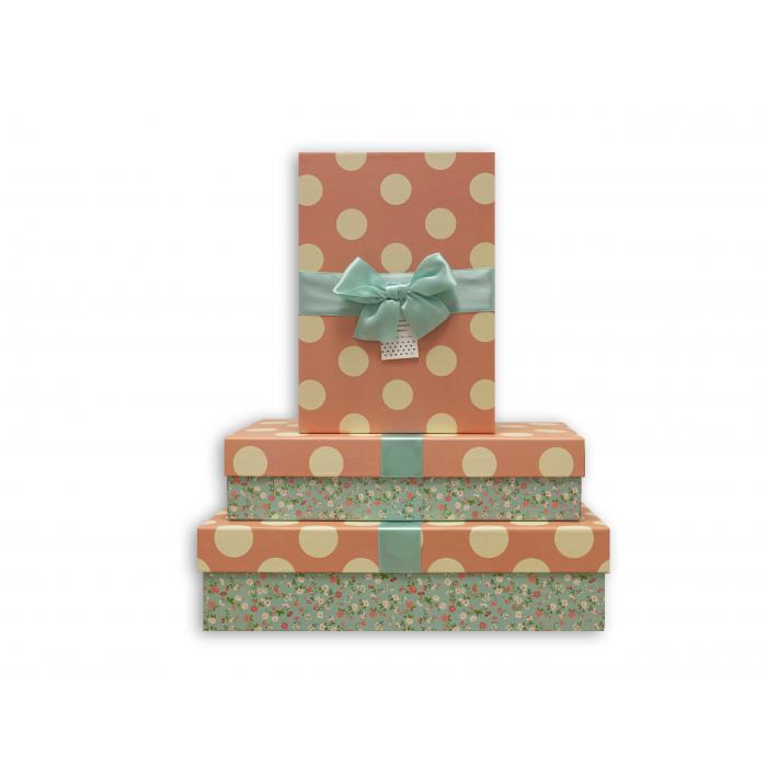Dárkové krabice se vzorem puntíků a stuhou na víku a vzorem květin na krabici.