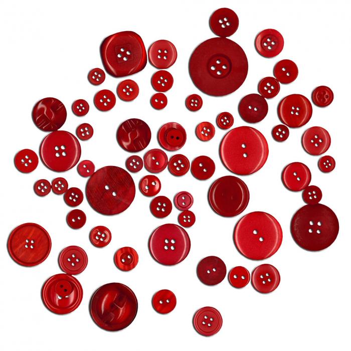 Dekorační knoflíky, mix velikostí a motivů. Balení obsahuje 40g knofílků v červené barvě.