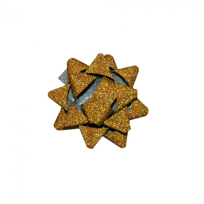 Dekorační rozeta s metalickými a brokátovými prvky o velikost 5 cm, šířka stuhy 1 cm, počet rohů 12.