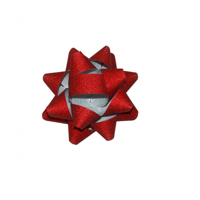 Dekorační rozeta s brokátovými a metalickými prvky o velikost 7,5 cm, šířka stuhy 1 cm, počet rohů 28. Balení obsahuje mix 24ks.