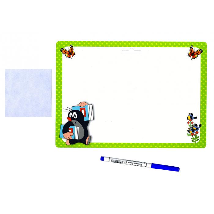 Stíratelná tabulka Krtek - zelená kat.č:05932EAN:8595038705932Skladem:5 ksmin.odběr:1 ksVelikost:A4 Výrobce:Akim Oboustranná stíratelná tabulka včetně hadříku a popisovače.