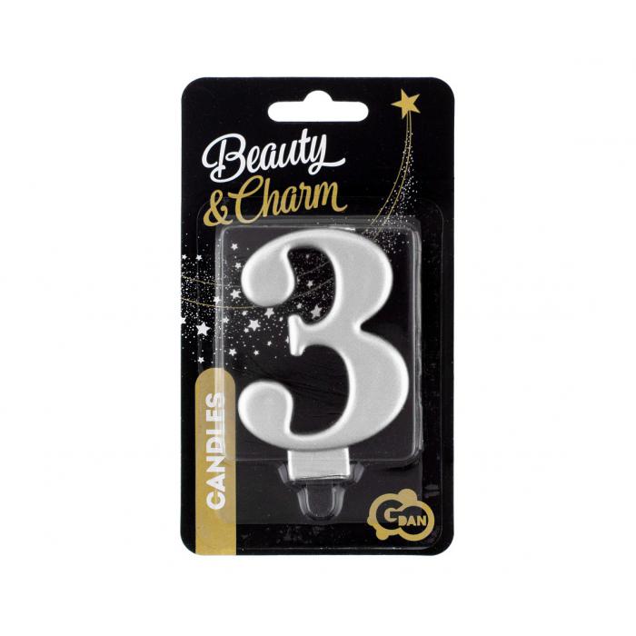 Stříbrná dortová svíčka č. 3 s metalickým leskem.