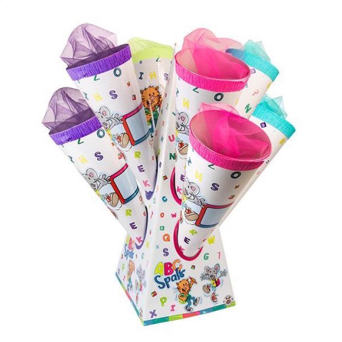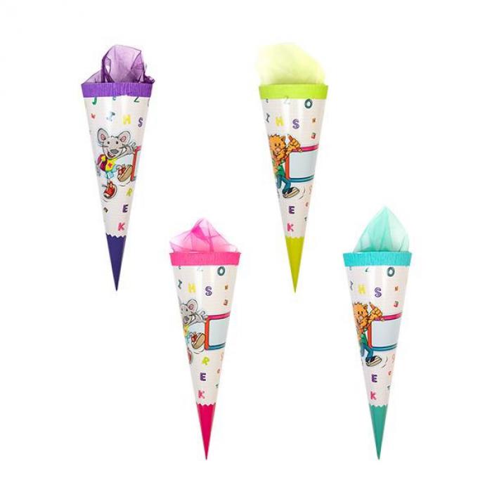 Kornout z tvrdého papíru s barevným motivem vhodný pro prvnáčky.
