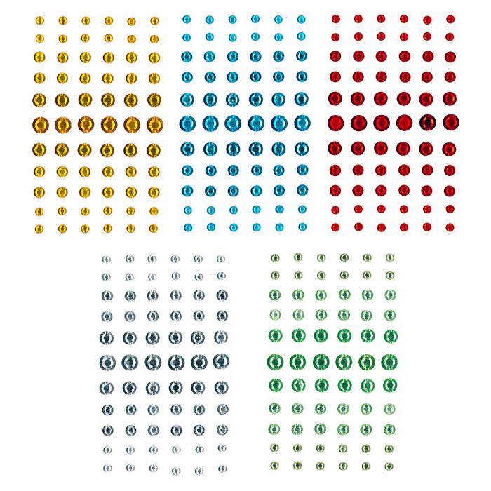 Nalepovací kamínky - plastové, 5 barevných provední (bílá, červená, zelená, modrá, žlutá), jedno balení obsahuje 1 barvu.
