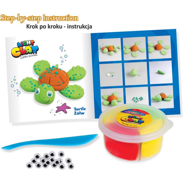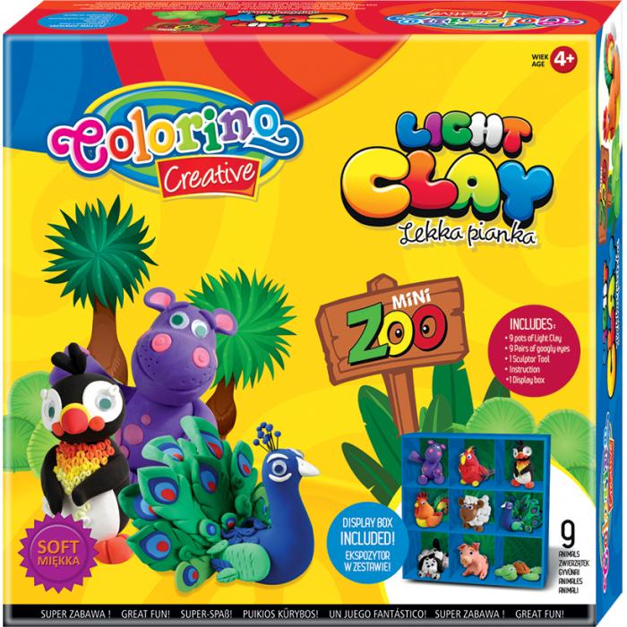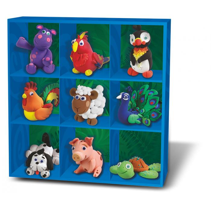 Sada obsahuje 9 kelímků pěnové hmoty, 9 párů plastových očí, plastový nůž, obrázkový návod krok za krokem, box na hotové figurky.