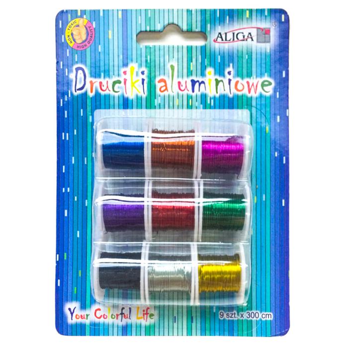 Barevné hliníkové drátky na blistru. Blistr obsahuje 9 barev.
