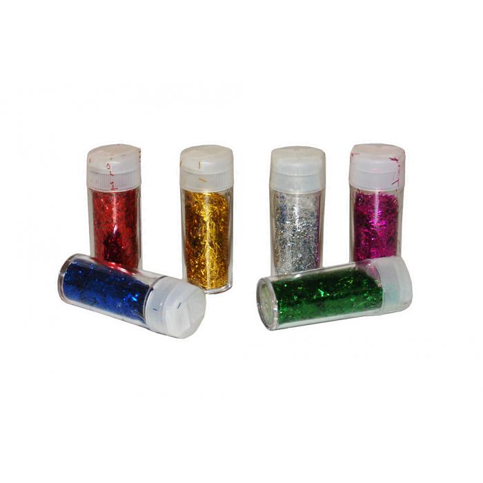 Brokátové proužky v praktickém kelímku. Jeden kelímek obsahuje 5 gramů barevného metalického brokátu, celé balení obsahuje 6 x 6 barev (36 kelímků).