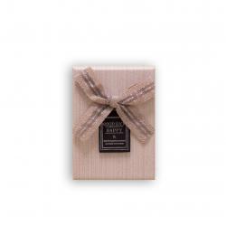 Dárkové krabice se vzorem puntíků a stuhou na víku a vzorem květin na krabici.