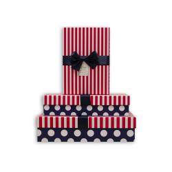 Dárkové krabice se vzorem proužků a stuhou na víku a vzorem puntíků na krabici.