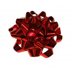 Metalická rozeta o velikost 7,5 cm, šířka stuhy 1 cm, počet rohů 28, barva červená.