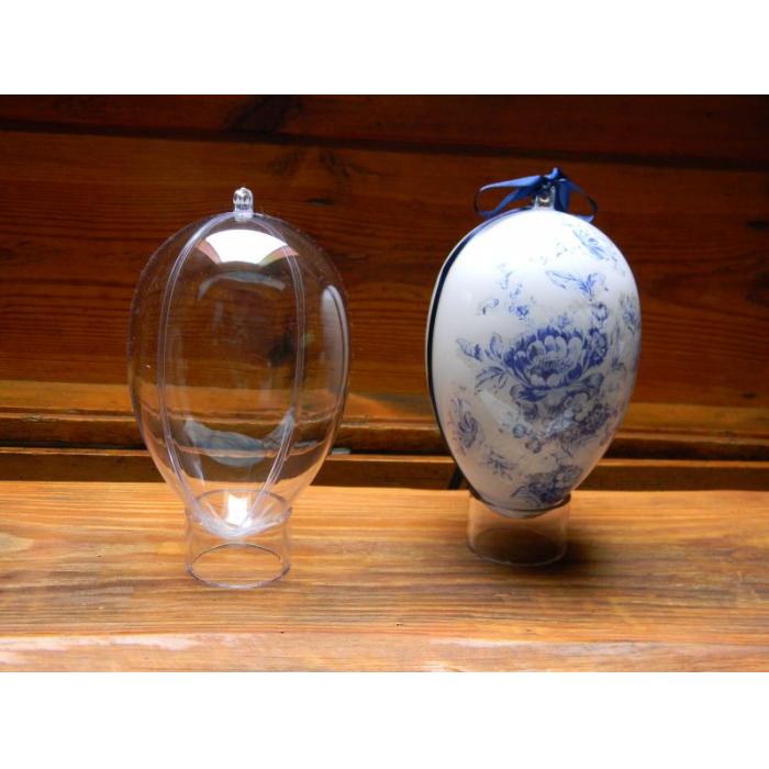 Průhledné plastové vejce složené ze dvou částí s háčkem na zavěšení. Velikost 6,5 cm. Vejce lze plnit nebo použít na dekorování (např. obháčkování, polepení ubrousky, glitry atd.).