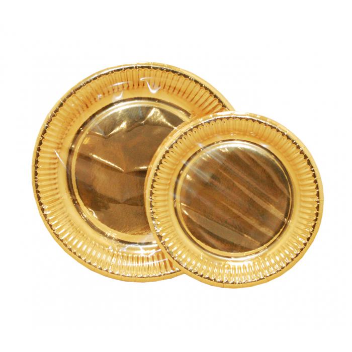 Papírový talíř - zlatý, velký 8 ks kat.č:005400EAN:0Skladem:NEmin.odběr:1 balVelikost:⌀ 22,7 cm • 8 ks Výrobce:Pol-Mak Papírové talíře zlatý, průměr 22,7 cm, balení obsahuje 8ks.