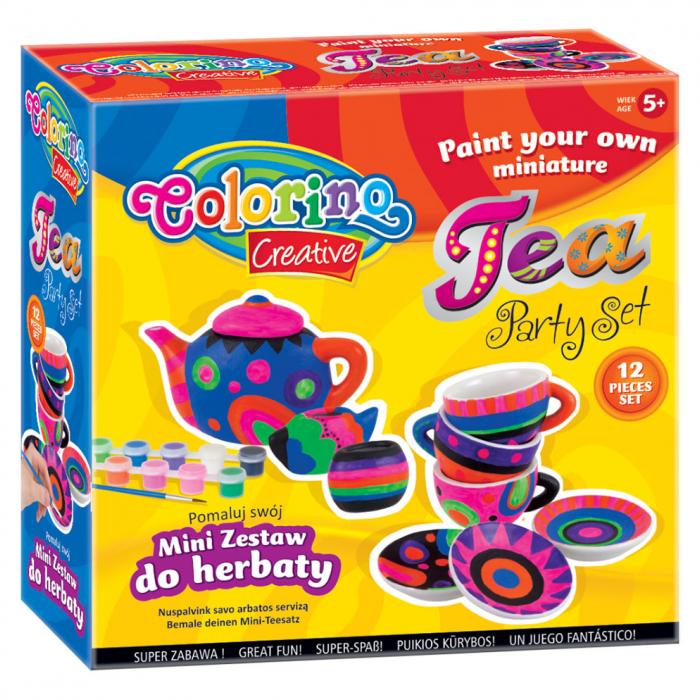 džbáneček, 3 šálky s podšálky, cukřenku, džbánek na mléko, 3 lžičky, 12 akrylových barev, štětec, brokát ke zdobení.