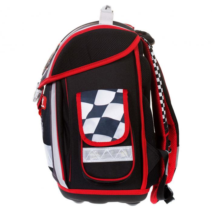 Lehký školní batoh (1100g) Racing s mnoha funkčními prvky. Vyroben z vysoce kvalitního, pevného a nepromokavého materiálu. Zesílená konstrukce a pevné dno pro lepší stabilitu. Ergonomicky tvarovaná polstrovaná záda a ramenní popruhy. Gumová rukojeť, poutko pro zavěšení. Spolehlivý a snadno použitelný kovový zámek. Reflexní prvky na všech stranách pro větší bezpečnost a viditelnost. Pevné dno pro lepší stabilitu.
