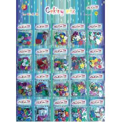 Barevné flitry mnoha různých tvarů v baleních po 2 gramech.