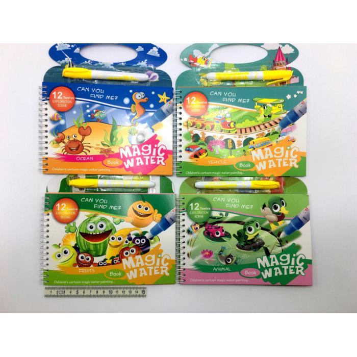 Speciální tužkou, do které nalijete vodu vymalováváte krásné obrázky. Obrázky se po nanesení vody zbarví, a až voda zaschne, opět zmizí a můžete malovat znovu. Použití: Naplňte tělo pera vodou a důkladně ho uzavřete. Na malém kousku papíru lehce zmáčkněte, abyste vodu dostali až do štětce. Poté můžete začít malovat. Pokud vodu z pera vypotřebujete, pero opět naplňte a můžete pokračovat. Když voda z papíru uschne, můžete začít malovat znovu. K opakovanému vybarvní nabízí knížka 4 krásné celostránkové motivy.