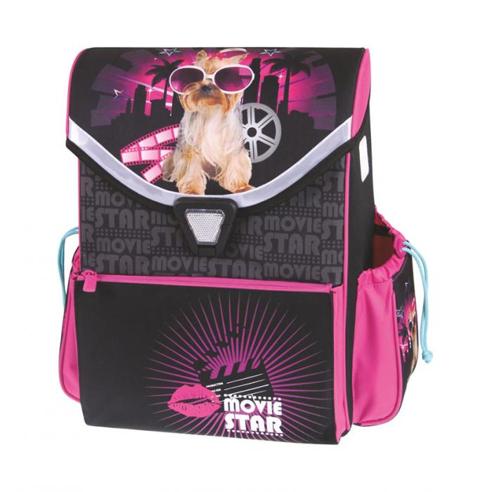 Školní batoh Movie Star s pevnou konstrukcí. 3 vnější kapsy, vnitřní kapsa rozdělená přepážkou. Bezpečnostní reflexní prvky. Vodě odolná tkanina. Ergonomicky tvarovaná záda, měkké ramenní popruhy. Nový způsob lehkého otvírání a zavírání batohu.