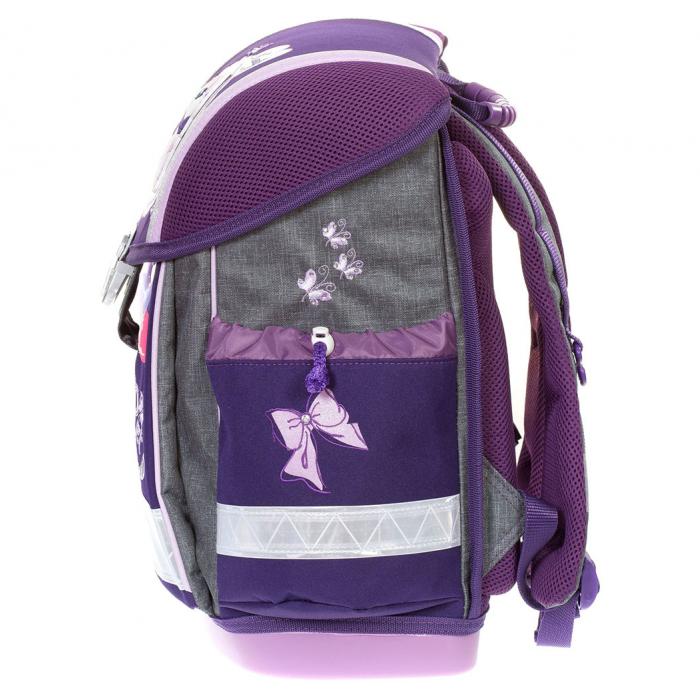 Lehký školní batoh (1000g) Lovely pet purple s mnoha funkčními prvky. Vyroben z vysoce kvalitního, pevného a nepromokavého materiálu. Zesílená konstrukce a pevné dno pro lepší stabilitu. Ergonomicky tvarovaná polstrovaná záda a ramenní popruhy. Gumová rukojeť, poutko pro zavěšení. Spolehlivý a snadno použitelný kovový zámek. Reflexní prvky na všech stranách pro větší bezpečnost a viditelnost.