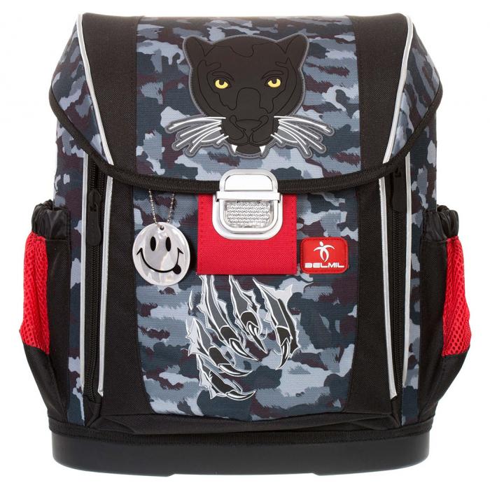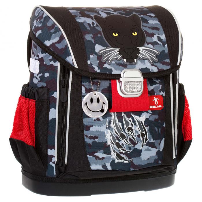 Lehký školní batoh (1100g) Jaguar New s mnoha funkčními prvky. Vyroben z vysoce kvalitního, pevného a nepromokavého materiálu. Zesílená konstrukce a pevné dno pro lepší stabilitu. Ergonomicky tvarovaná polstrovaná záda a ramenní popruhy, nastavitélná výška dle aktuální výšky dítěte pro lepší rozložení váhy. Bederní pás. Gumová rukojeť, poutko pro zavěšení. Spolehlivý a snadno použitelný kovový zámek. Reflexní prvky na všech stranách pro větší bezpečnost a viditelnost. Pevné dno pro lepší stabilitu.