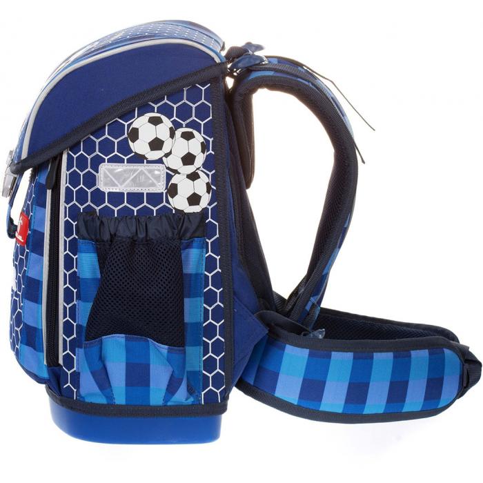 Lehký školní batoh (1100g) Bl-soccer s mnoha funkčními prvky. Vyroben z vysoce kvalitního, pevného a nepromokavého materiálu. Zesílená konstrukce a pevné dno pro lepší stabilitu. Ergonomicky tvarovaná polstrovaná záda a ramenní popruhy, nastavitélná výška dle aktuální výšky dítěte pro lepší rozložení váhy. Bederní pás. Gumová rukojeť, poutko pro zavěšení. Spolehlivý a snadno použitelný kovový zámek. Reflexní prvky na všech stranách pro větší bezpečnost a viditelnost. Pevné dno pro lepší stabilitu.