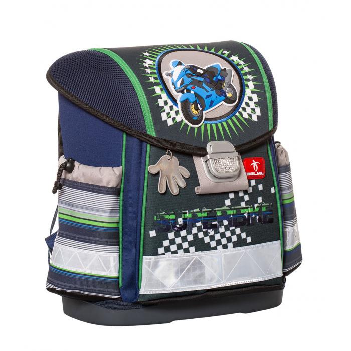 Lehký školní batoh (1000g) Super Bike s mnoha funkčními prvky. Vyroben z vysoce kvalitního, pevného a nepromokavého materiálu. Zesílená konstrukce a pevné dno pro lepší stabilitu. Ergonomicky tvarovaná polstrovaná záda a ramenní popruhy. Gumová rukojeť, poutko pro zavěšení. Spolehlivý a snadno použitelný kovový zámek. Reflexní prvky na všech stranách pro větší bezpečnost a viditelnost.