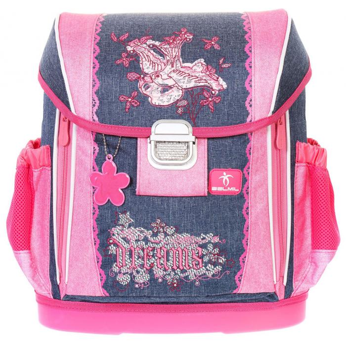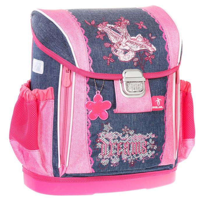 Lehký školní batoh (1100g) Dreams s mnoha funkčními prvky. Vyroben z vysoce kvalitního, pevného a nepromokavého materiálu. Zesílená konstrukce a pevné dno pro lepší stabilitu. Ergonomicky tvarovaná polstrovaná záda a ramenní popruhy, nastavitélná výška dle aktuální výšky dítěte pro lepší rozložení váhy. Gumová rukojeť, poutko pro zavěšení. Spolehlivý a snadno použitelný kovový zámek. Reflexní prvky na všech stranách pro větší bezpečnost a viditelnost. Pevné dno pro lepší stabilitu.