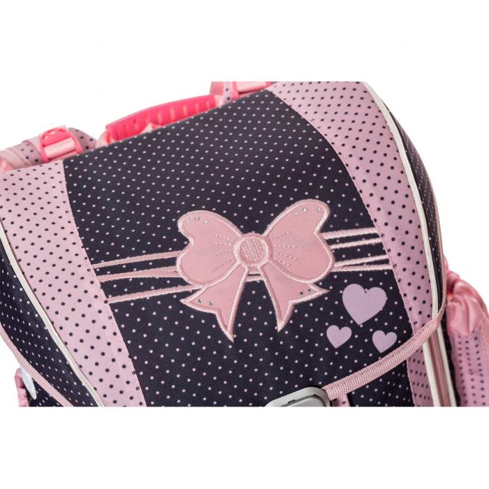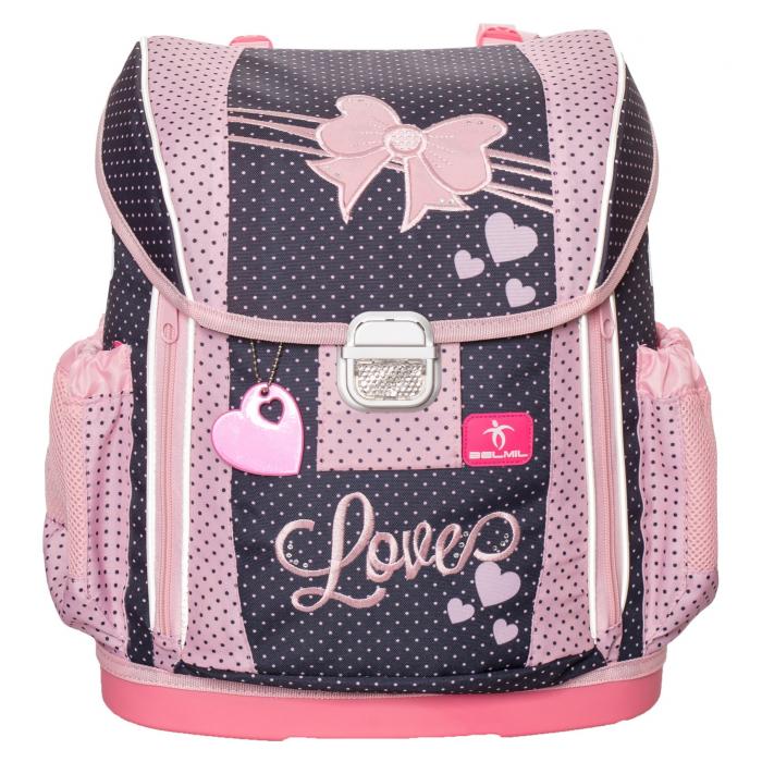 Lehký školní batoh (1100g) Elegant s mnoha funkčními prvky. Vyroben z vysoce kvalitního, pevného a nepromokavého materiálu. Zesílená konstrukce a pevné dno pro lepší stabilitu. Ergonomicky tvarovaná polstrovaná záda a ramenní popruhy, nastavitélná výška dle aktuální výšky dítěte pro lepší rozložení váhyš. Gumová rukojeť, poutko pro zavěšení. Spolehlivý a snadno použitelný kovový zámek. Reflexní prvky na všech stranách pro větší bezpečnost a viditelnost. Pevné dno pro lepší stabilitu.