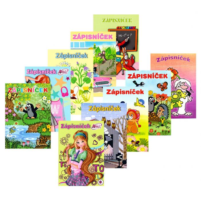 Zápisníček A6, mix různých motivů (Winx, Krtek,Křemílek a Vochomůrka atp. ). Zápisníček obsahuje rozvrh hodin, univerzální kalendář a 14 linkovaných stran na poznámky.