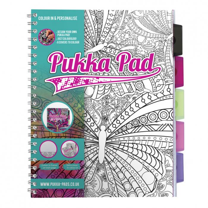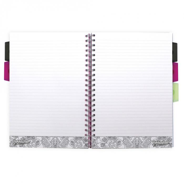 Poznámkový blok s boční spirálou, A4, 100 listů, linkovaný. 6 stran k vybarvení + zápatí na každé straně. Barevné rozlišovače s kapsou pro lepší orientaci, možnost libovolného přesunutí. Perforované stránky.