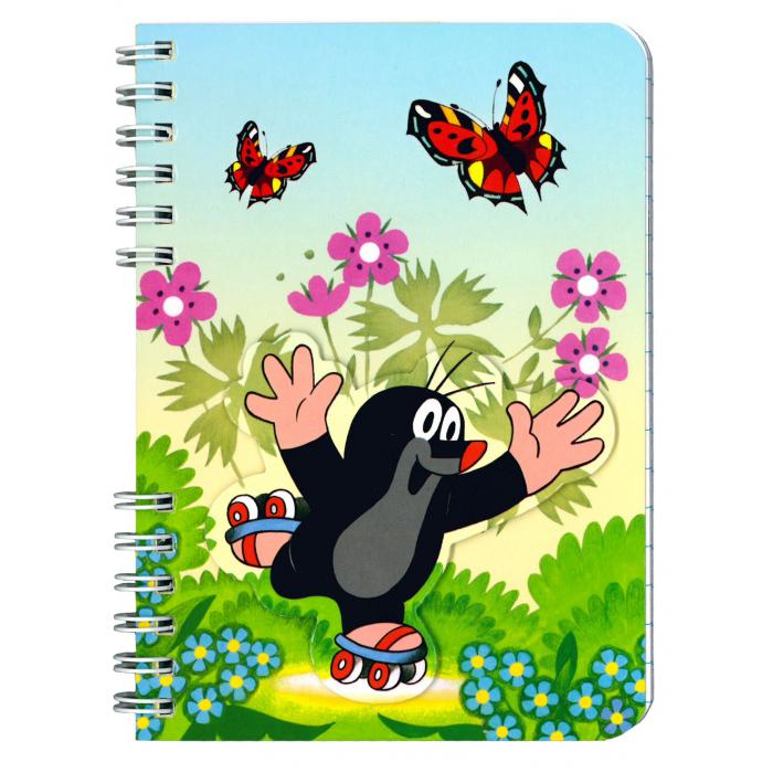 Bloček s boční spirálou A6 Krtek a brusle, 3D přední stránka, linkovaný, 50 listů, včetně rozvrhu hodin, univerzálního kalendária pro školní rok a papírového pravítka k odstřižení.