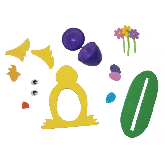 pěnové části, samolepky z pěny, žinylkové dráty, pohyblivé oči, plastové otvíratelné vajíčko.