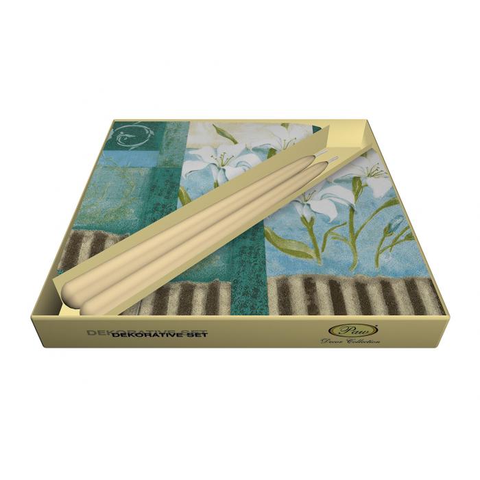 Sada PAW Chic Lily kat.č:SSC 002700EAN:0Skladem:NEmin.odběr:1 balVelikost:20,5 x 20,5 cm Výrobce:Paw (2 svíčky, 20 ubrousků)