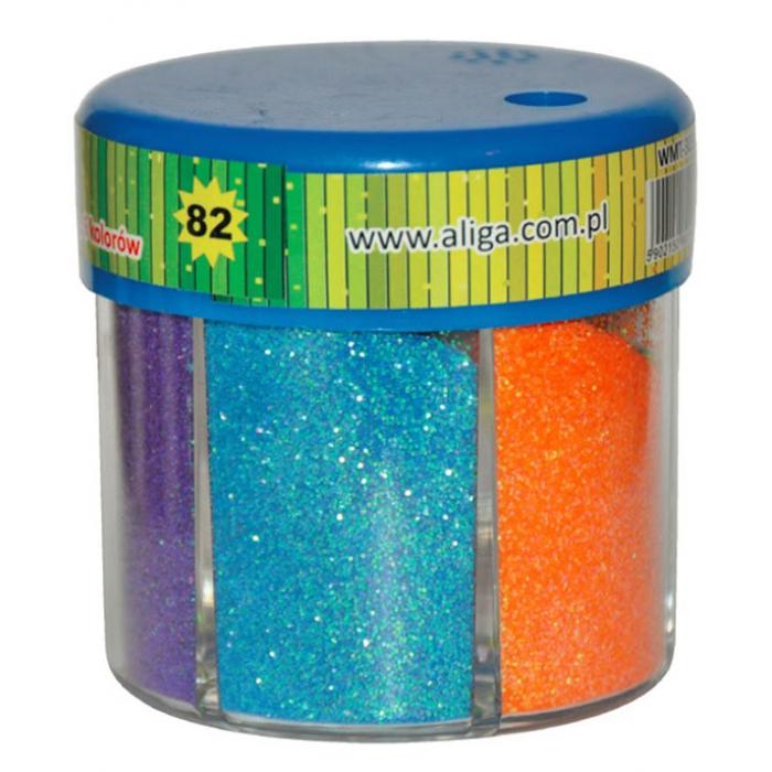 Sypký brokát v praktickém kelímku obsahujíc 6 barev o celkové hmotnosti 80 gramů.