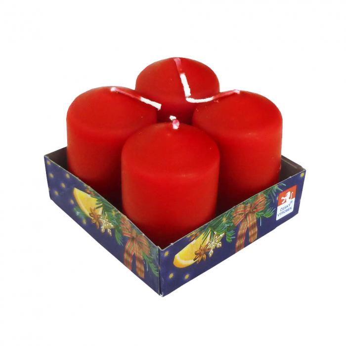 Svíčky malý válec - červené kat.č:07395EAN:5908260607395Skladem:NEmin.odběr:1 bal po 4 ksVelikost:4 x 6 cm Výrobce:Jula Sada adventních svíček - válec.Barva: červená.