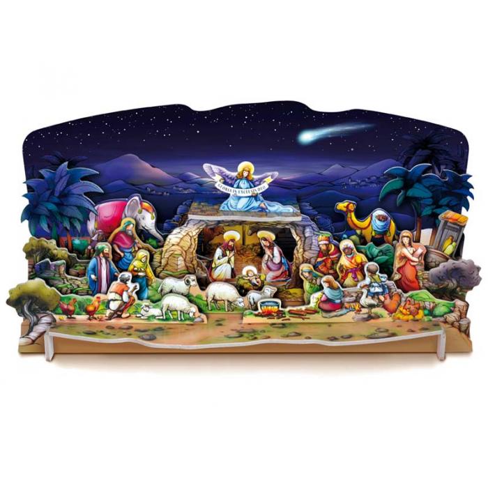 Vysekávaný, jednoduše sestavitelný betlém bez lepidla a nůžek. Vyrobený z 3 mm silné lepenky potažené laminem, rozměr sestaveného betlému 44 x 21 x 18cm.