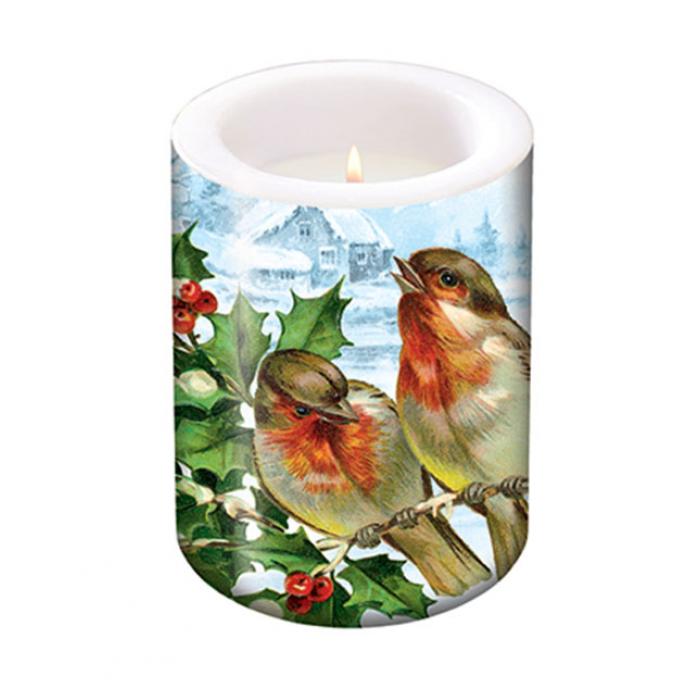 Svíčka s motivem ubrousku Winter Bullfinch vytvářející po zapálení dojem lampionu.