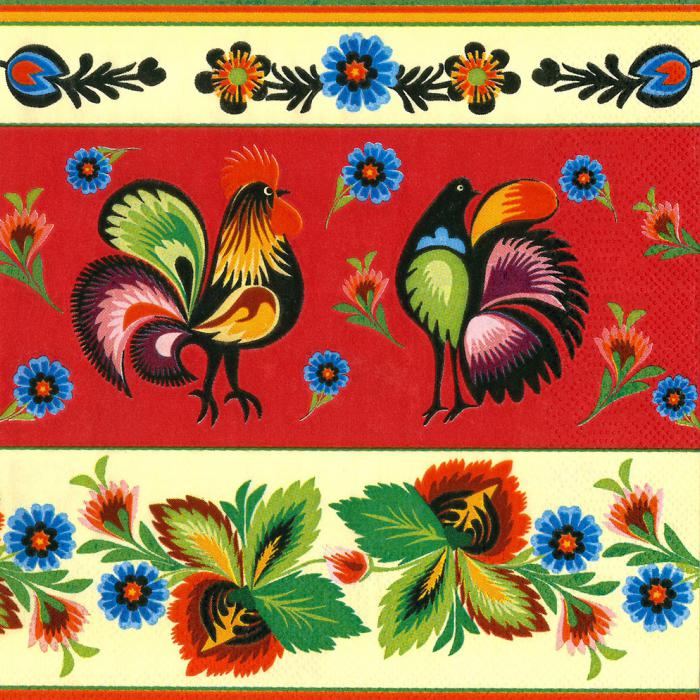 Papírový ubrousek Folklore Roosters Cream & Red SLOG 043801