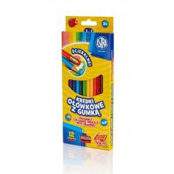 Gumovatelné trojhranné pastelky s gumou, 12 barev + ořezávátko.