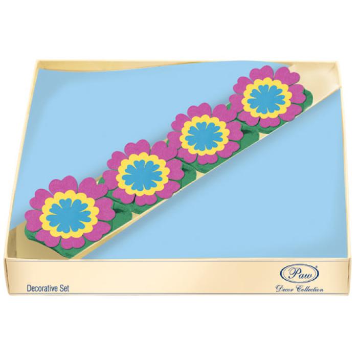 Sada PAW Hippie Flowers kat.č:SSC 010501EAN:0Skladem:ANOmin.odběr:1 balVelikost:20,5 x 20,5 cm Výrobce:Paw Dekorační sada PAW, 20 ubrousků, 4 filcové prsteny na ubrousky.